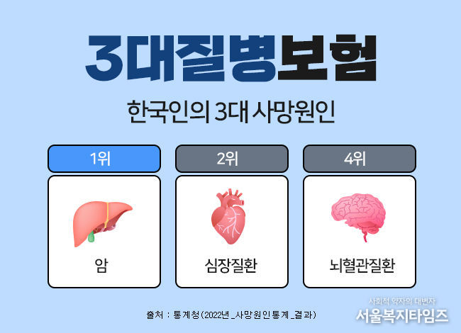 서울복지타임즈 이재연 기자 | 흔히 3대질병이라 일컫는 암, 심혈관질환, 뇌혈관질환은 통계청 발표자료에 따르면 한국인의 주요 사망원인 중에서 3위 폐렴을 제외하고 1~4위를 차지하고 있으며, 이전부터 지금까지도 살면서 가장 먼저 대비해야 하는 치명적인 질병으로 강조되고 있다. 이러한 중대질병에 대비하기 위하여 상기 세가지 치명적인 질병을 집중보장하는 3대질병진단비보험을 많이 가입하고 있다. 3대진단비보험은 각각의 질병을 중점적으로 보장하면서도 가입자 특성에 맞는 특약을 추가함으로써 종합건강보험으로도 활용할 수가 있다.