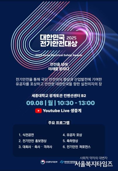 서울복지타임즈 이재연 기자 | 산업통상자원부는 9월 8일, 서울 세종대 컨벤션센터 광개토관에서 「제28회 대한민국 전기안전대상」을 개최한다.