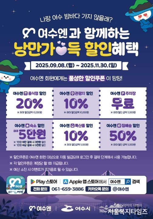 서울복지타임즈 이재연 기자 | 여수시는 9월 8일부터 11월 30일까지 여수 스마트관광 통합플랫폼 ‘여수엔’ 회원을 대상으로 ‘2025년 하반기 야간관광 프로모션’을 진행한다.