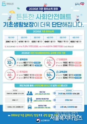 2026년 기준중위소득(국민 가구소득의 중간값으로 복지사업 선정기준)은 4인 가구 기준 649만 5천 원으로 확정됐다.