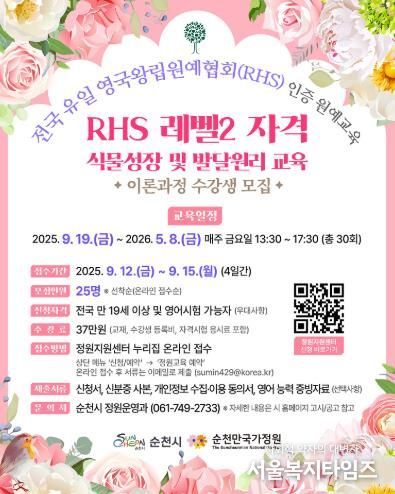 서울복지타임즈 이재연 기자 | 순천시는 정원원예와 식물학 분야에서 세계적으로 권위를 인정받는 영국왕립원예협회의 ‘RHS 레벨2 자격 식물성장 및 발달원리 교육(RHS Level 2 Certificate in the Principles of Plant Growth and Development)’ 이론 과정 수강생을 모집한다고 밝혔다.