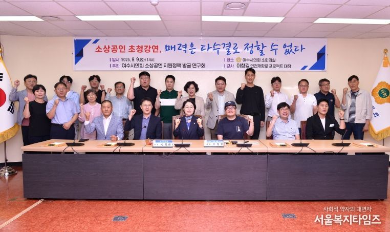 서울복지타임즈 이재연 기자 | 여수시의회는 지난 9일 시의회 소회의실에서 ‘소상공인 지속가능 방안 및 혁신정책 발굴’을 주제로 초청강연을 열고, 소상공인들의 자생력 확보를 위한 다양한 의견을 수렴했다.