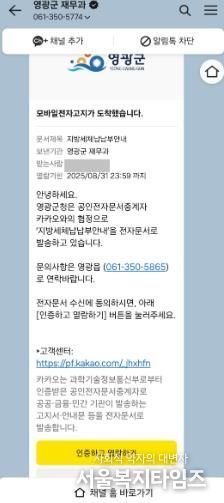 서울복지타임즈 이재연 기자 | 영광군은 지난 8월 5일에 이어 오는 9월 11일, 지방세 납부 기한을 넘긴 체납자를 대상으로 **'카카오 알림톡'**을 활용한 모바일 전자고지 2차 전송을 시행한다고 밝혔다.