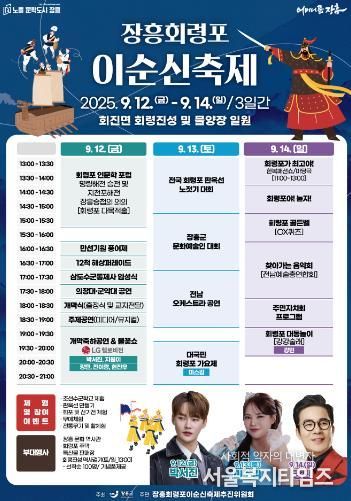 서울복지타임즈 이재연 기자 | 장흥군은 9월 12일부터 14일까지 3일간, 장흥군 회진면 회령진성 및 회진항 물양장 일원에서 2025 장흥 회령포 이순신 축제를 개최한다고 밝혔다.