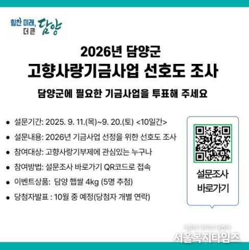 서울복지타임즈 이재연 기자 | 담양군은 2026년 고향사랑기금사업 선정에 기부자와 군민의 의견을 반영하기 위해 11일부터 20일까지 10일간 ‘담양군 고향사랑기금사업 선호도조사’를 진행한다.