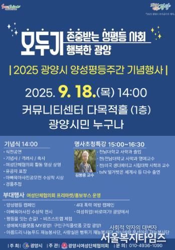 서울복지타임즈 이재연 기자 | 광양시는 오는 9월 18일 오후 2시, 커뮤니티센터 다목적홀에서 2025년 양성평등주간 기념행사를 개최한다고 밝혔다.