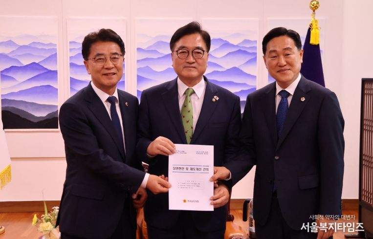서울복지타임즈 이재연 기자 | 전라남도의회 김태균 의장은 강문성 기획행정위원장과 함께 9월 11일 국회를 방문해 우원식 국회의장을 접견하고, 청년 인구 유출과 지역경제 침체, 지방의원 사직기한 차별 문제 해소 등 현안 해결을 위한 제도 개선과 국회 차원의 지원을 강력히 요청했다.