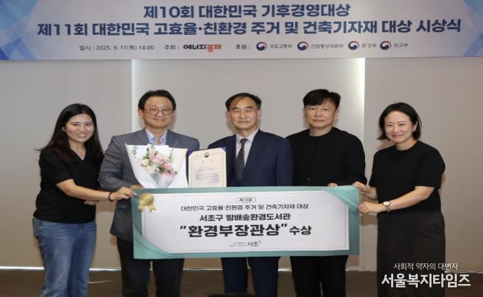 서울복지타임즈 이재연 기자 | 서울 서초구가 11일 에너지경제신문이 주관한 ‘제11회 대한민국 고효율·친환경 주거 및 건축기자재 대상’에서 서초구립 방배숲환경도서관이 환경부장관상을 수상했다고 밝혔다.