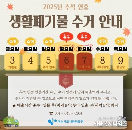 특히 6일과 7일은 연휴로 인해 생활폐기물 정기 수거가 잠시 중단되지만, 비상근무 인력을 투입해 시민 불편을 최소화하겠다는 계획이다.