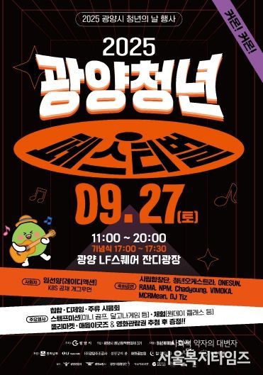 서울복지타임즈 이재연 기자 | 광양시는 ‘2025년 청년의 날’을 기념해 오는 9월 27일 오전 11시부터 20시까지 LF스퀘어 잔디광장에서 ‘2025년 광양 청년 페스티벌’을 개최한다고 밝혔다.