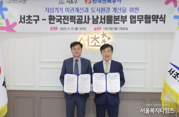 서울복지타임즈 이재연 기자 | 서울 서초구가 15일 서초구청에서 한국전력 남서울본부와 ‘지상기기 미관 개선과 도시환경 개선을 위한 업무협약’을 체결했다고 밝혔다. 이번 협약은 두 기관이 상호 협력하여 서초구 공공보도상 지상기기 정비를 통해 도시환경을 개선하고 쾌적한 보행환경을 만들기 위해 추진됐다.
