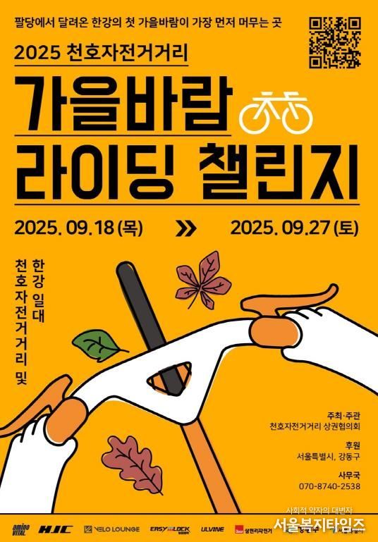 이번 행사는 천호자전거거리 상권협의회가 주최하고 서울시와 강동구가 후원하며,자전거 문화 확산과 지역 상권 활성화를 위해 마련됐다. 지난 봄 4,300여 명이 참여한 벚꽃 라이딩 챌린지에 이어, 이번에는 ‘팔당에서 달려온 한강의 첫 가을바람이 가장 먼저 머무는 곳’이라는 테마로 라이딩의 즐거움을 선사할 예정이다.