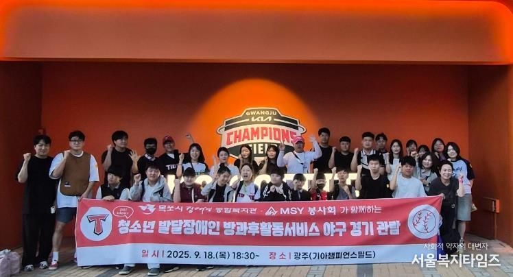 서울복지타임즈 이재연 기자 | 목포시장애인종합복지관은 9월 18일 청소년 발달장애인 방과후활동서비스 참여학생 15명과 MSY봉사회 회원 14명이 함께 광주-기아 챔피언스 필드를 찾아 기아 타이거즈와 한화 이글스의 프로야구 경기 관람 체험활동을 진행했다.