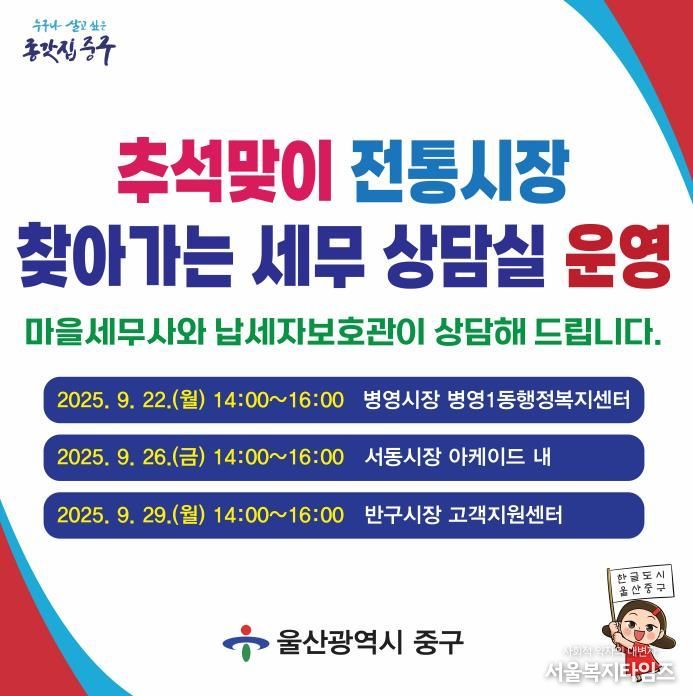 서울복지타임즈 이재연 기자 | 울산 중구가 추석 명절을 앞두고 지역 내 전통시장 3곳에서 ‘찾아가는 마을세무사 무료 세무 상담’ 행사를 연다.