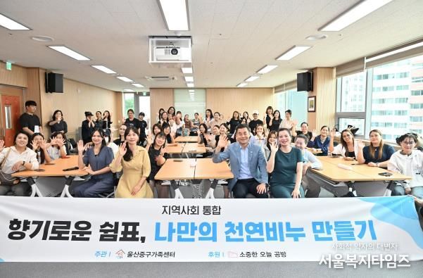 서울복지타임즈 이재연 기자 | 울산중구가족센터가 9월 19일 오후 2시 울산중구가족센터 다목적실에서 지역 주민 50여 명을 대상으로 ‘향기로운 쉼표, 나만의 천연비누 만들기’ 프로그램을 운영했다.