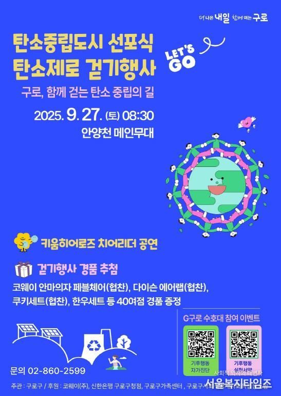 서울복지타임즈 이재연 기자 | 구로구가 오는 27일 오전 8시 30분 안양천 구로G페스티벌 메인무대에서 ‘구로, 함께 걷는 탄소중립의 길’을 주제로 ‘탄소중립도시 구로’ 선포식을 개최한다.