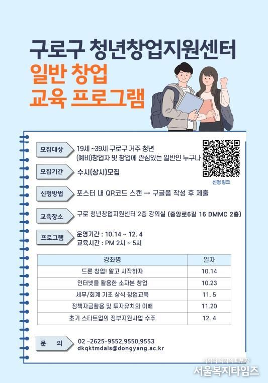 서울복지타임즈 이재연 기자 | 구로구가 오는 10월부터 12월까지 청년창업지원센터를 통해 ‘일반 창업교육’과 ‘전문 창업교육’을 운영한다고 밝혔다. 청년의 창업역량 강화를 통해 안정적인 창업 기반을 마련하기 위한 취지다.
