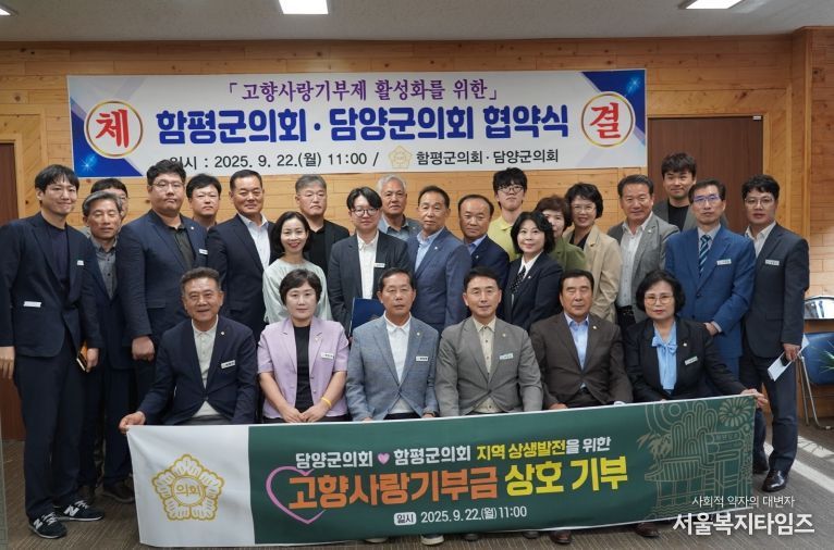 서울복지타임즈 이재연 기자 | 담양군의회는 22일 함평군의회에서 고향사랑기부금 상호 기탁식을 갖고, 기부 문화 확산과 동시에 지역사랑 실천에 앞장서는 뜻깊은 행보를 이어갔다.