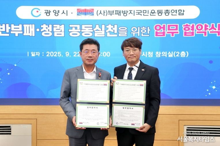서울복지타임즈 이재연 기자 | 광양시는 9월 22일 시청 창의실에서 (사)부패방지국민운동총연합과 반부패 청렴 공동실천을 위한 업무협약을 체결했다고 밝혔다.