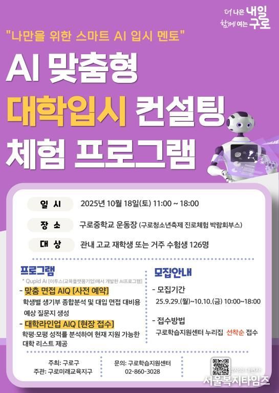 서울복지타임즈 이재연 기자 | 구로구가 10월 18일 오전 11시부터 구로중학교 운동장에서 AI와 함께하는 대학 입시 상담(컨설팅)을 개최한다고 밝혔다.