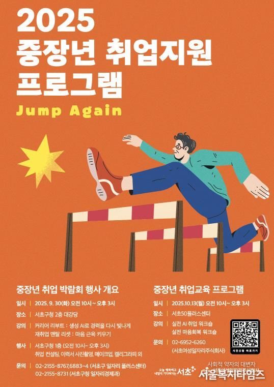 서울복지타임즈 이재연 기자 | 서울 서초구는 중장년의 구직 활동을 응원하기 위해 오는 30일 취업지원 프로그램 ‘점프 어게인(JUMP AGAIN)’을 개최한다고 밝혔다.