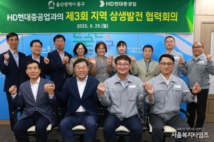 서울복지타임즈 이재연 기자 | 울산 동구청과 HD현대중공업은 9월 29일 오전 11시 동구청장실에서 ‘제3회 지역 상생발전 협력회의’를 개최했다. 이날 회의에는 김종훈 동구청장과 HD현대중공업 김상회 전무를 비롯한 양측 간부 공무원과 임직원이 참석했다.