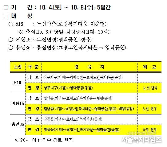 상무지구~종합버스터미널~영락공원을 운행하는 518번 시내버스는 추석 당일(6일) 30회 증차 운행하고, 월남동~태령을 운행하는 지원15번은 영락공원을 경유해 운행한다.