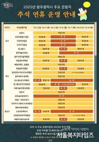 이승규 신활력추진본부장은 “광주에는 북적이는 관광지가 아니더라도 조용하고 매력적인 숨은 명소가 많다”며 “추석 연휴 시민과 관광객들이 광주의 가을 정취 속에서 여유롭고 풍성한 명절을 보내시길 바란다”고 말했다.
