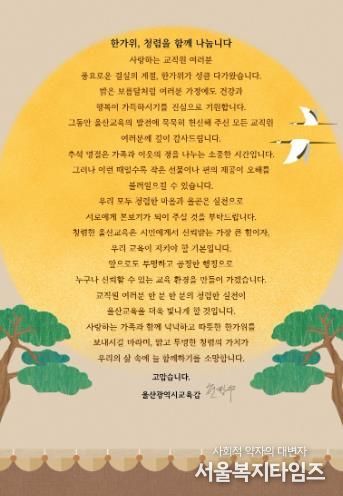 서울복지타임즈 이재연 기자 | 울산광역시교육청은 추석을 앞두고 1일 울산 지역 전 교육기관과 학교 교직원들에게 청렴 의지를 다지는‘청렴 서한문’을 보냈다.