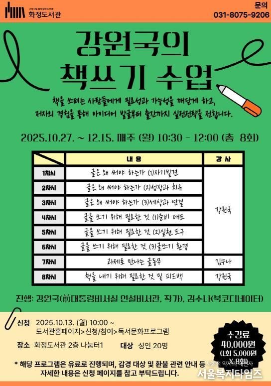 서울복지타임즈 이재연 기자 | 고양특례시는 10월 27일부터 12월 15일까지 매주 월요일 오전 10시 30분부터 12시까지, 화정도서관 2층 나눔터1에서 ‘강원국의 책쓰기 수업’프로그램을 운영한다고 밝혔다.