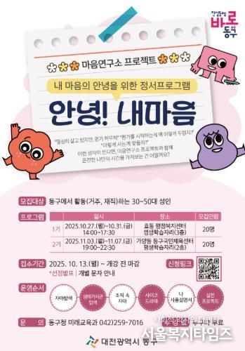 서울복지타임즈 이재연 기자 | 대전 동구는 오는 13일부터 ‘내 마음의 안녕을 위한 정서프로그램’ 학습자를 모집한다고 10일 밝혔다.