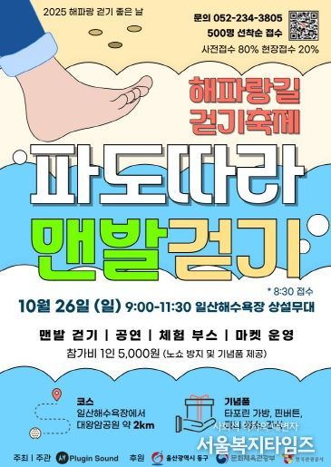 서울복지타임즈 이재연 기자 | 울산 동구가 오는 10월 26일 오전 9시부터 11시 30분까지 일산해수욕장 상설무대 일원에서 ‘2025 해파랑길 걷기 축제 – 파도 따라 맨발 걷기’를 개최한다.