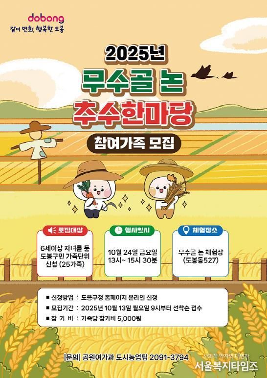 서울복지타임즈 이재연 기자 | 서울 도봉구가 오는 10월 24일 무수골 친환경 논 체험장(도봉동 527)에서 ‘무수골 논 추수한마당’ 행사를 개최한다.