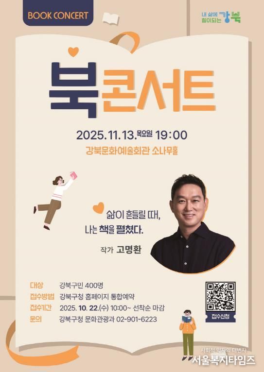 서울복지타임즈 이재연 기자 | 서울 강북구는 오는 11월 13일 오후 7시, 강북문화예술회관 소나무홀에서 고명환 작가 초청 북콘서트를 개최한다고 밝혔다.