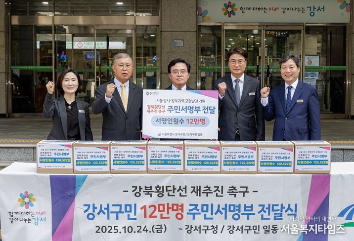 서울복지타임즈 이재연 기자 | 서울 강서구는 24일 강북횡단선 신속 재추진을 위한 12만 주민 서명부 전달식을 개최했다.