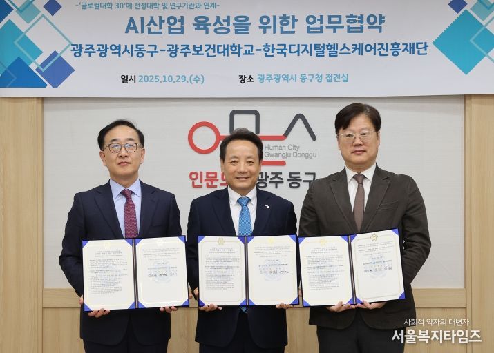 서울복지타임즈 이재연 기자 | 광주 동구는 지난 29일 구청 접견실에서 광주보건대학교(총장 김경태), 한국디지털헬스케어진흥재단(원장 박기원)과 인공지능(AI) 헬스케어 산업 육성, 인구 감소 해결, 원도심 활성화를 위한 업무협약을 체결했다고 밝혔다.