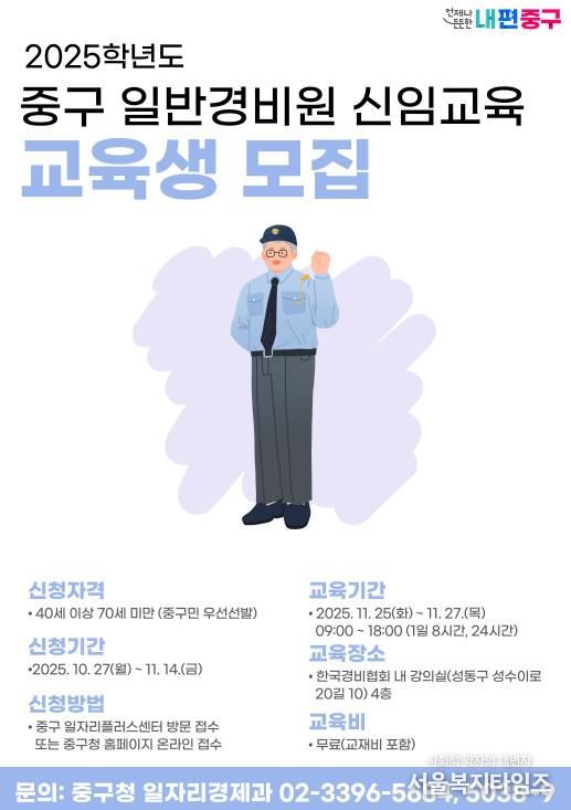 서울복지타임즈 이재연 기자 | 서울 중구가 법정의무교육 이수부터 취업연계까지 원스톱으로 지원하는 실무 중심의 '일반경비원 신임교육 과정'을 무료로 운영한다.