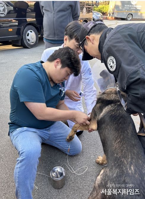 이번에 운영한 의료지원팀에는 경상국립대학교 수의과대학 팀을 비롯해 부산여대 동물보건과 이영덕 교수, 경찰관 이세민 경위(수의사) 등 수의사 7명이 참여했다.