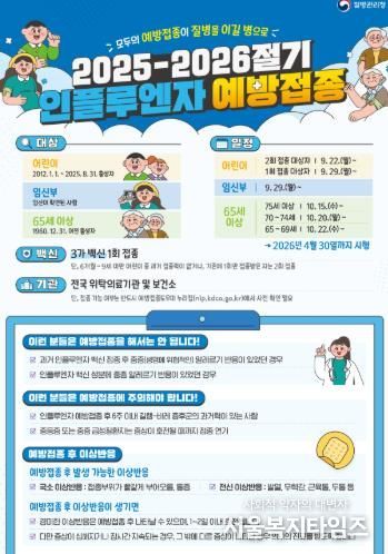 특히 어린이, 65세 이상 어르신, 임신부, 만성질환자 등 고위험군은 합병증 발생 위험이 높아 11월 중 예방접종을 완료하는 것이 중요하다.