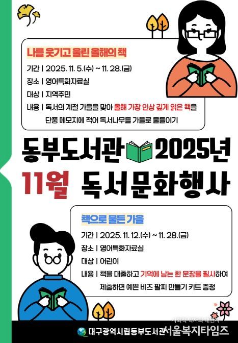 서울복지타임즈 이재연 기자 | 대구동부도서관은 11월 5일부터 28일까지 동부도서관 영어특화자료실과 누리집에서 ‘2025년 11월 독서문화행사’를 운영한다고 밝혔다.