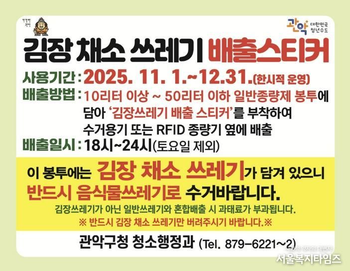 서울복지타임즈 이재연 기자 | 관악구는 김장철을 맞아 대량으로 발생하는 채소류 쓰레기로 인한 주민불편을 해소하고 쾌적한 생활환경을 조성하기 위해 11월 1일부터 12월 31일까지 ‘김장철 채소쓰레기 특별처리기간’을 운영한다.