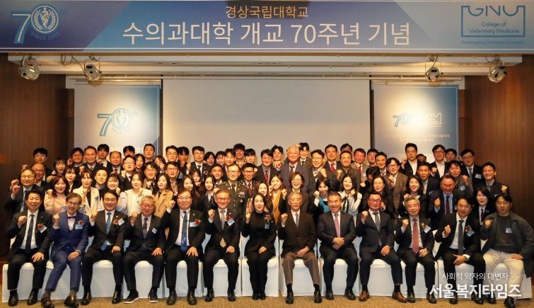 서울복지타임즈 이재연 기자 | 경상국립대학교 재경 수의과대학 동문회(회장 하지영)는 11월 6일 저녁 서울신라호텔 영빈관에서 ‘70년 개척의 자부심, 100년을 향한 새로운 비상’이라는 슬로건으로 ‘수의과대학 개교 70주년 기념행사’를 개최했다.