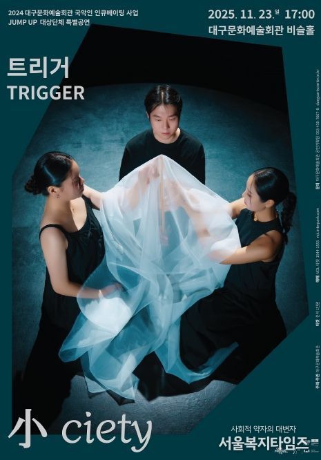 서울복지타임즈 이재연 기자 | 대구문화예술회관은 2024년 국악인 인큐베이팅 사업 'JUMP UP' 대상단체 특별공연으로, 한국 현악 트리오 트리거(TRIGGER)의 창작 공연 '小ciety'를 오는 11월 23일 비슬홀에서 선보인다.