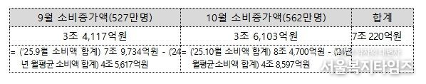 한편, 9·10월 환급(페이백) 지급 대상자(중복 포함, 1,089만명)가 작년 월평균 카드 소비액보다 총 7조 220억원을 더 지출한 것으로 확인됐다. 이는 지급액(6,430억원)의 11배에 달하는 규모다.