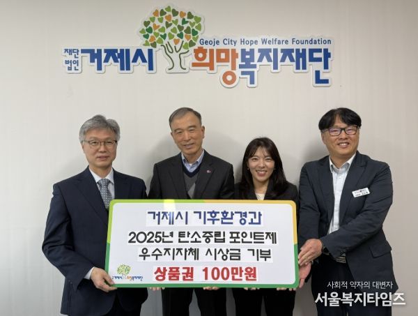 거제시 기후에너지환경부 주관 ‘2025년 탄소중립포인트제 우수 지자체 평가’에서 받은 시상금(온누리상품권 100만 원)을 전액 거제시희망복지재단에 기부했다고 27일 밝혔다.