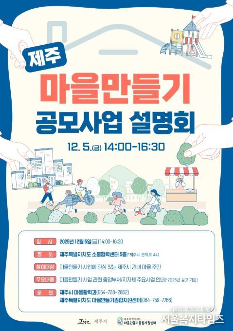 서울복지타임즈 이재연 기자 | 제주시는 주민 주도의 지속가능한 마을 만들기 기반을 조성하기 위해 12월 5일 제주특별자치도 소통협력센터 5층 다목적홀에서 ‘마을만들기 공모사업 설명회’를 개최한다.