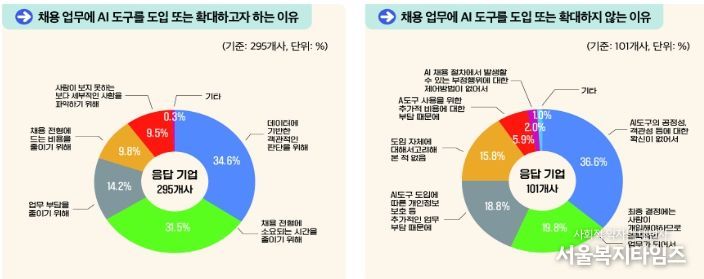 채용 업무에 AI 도구를 도입하거나 사용을 확대하고자 하는 이유로는 ‘데이터에 기반한 객관적인 판단을 위해’(34.6%), ‘채용 전형에 소요되는 시간을 줄이기 위해’(31.5%), ‘업무 부담을 줄이기 위해’(14.2%) 순으로 나타났다.