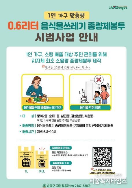 서울복지타임즈 이재연 기자 | 서울 송파구가 전국 지방자치단체 최초로 1인 가구에 최적화된 0.6ℓ 규격의 음식물쓰레기 종량제봉투를 오는 10일부터 시범 도입해 운영한다고 알렸다.