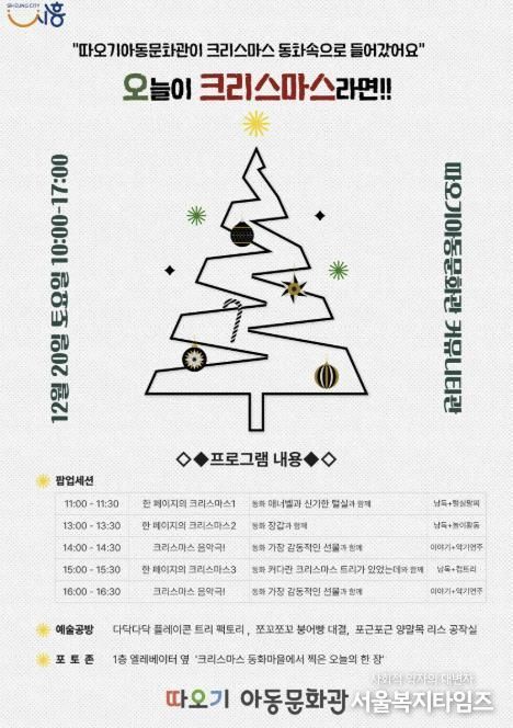 서울복지타임즈 이재연 기자 | 시흥시 따오기아동문화관이 오는 12월 20일 크리스마스 문화행사 ‘오늘이 크리스마스라면’을 연다. 반짝이는 트리, 서늘한 겨울 공기, 책장을 넘기는 소리가 한데 어우러지며 문화관은 잠시 ‘이야기가 살아 움직이는 공간’으로 변한다.