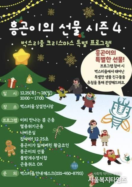 서울복지타임즈 이재연 기자 | 시흥시 곤충전시체험관 벅스리움이 크리스마스를 맞아 12월 25일부터 28일까지 ‘흥곤이의 선물’ 시즌4를 운영한다.